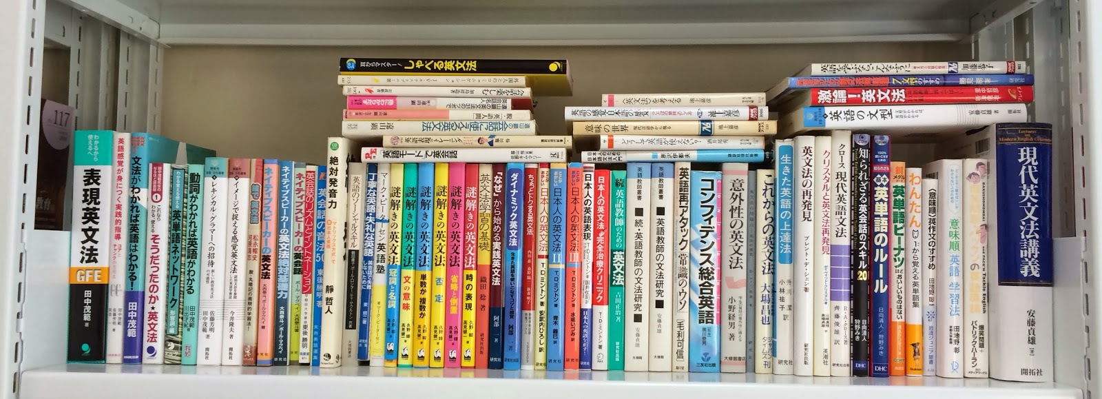 ワロスの途中の波瀾万丈のドラマは全てすっ飛ばして,結論として文法指導を考える上でおさえておきたい文法解説書(和書)とその周辺をあげてみる。というより,本棚の写真をあげてみる。貸し出し中の文献もあるが,こんなところだろうか。